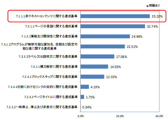 - 「7.1.1.1非テキストコンテンツに関する達成基準」(35.20%のページで達成等級Aに問題)
